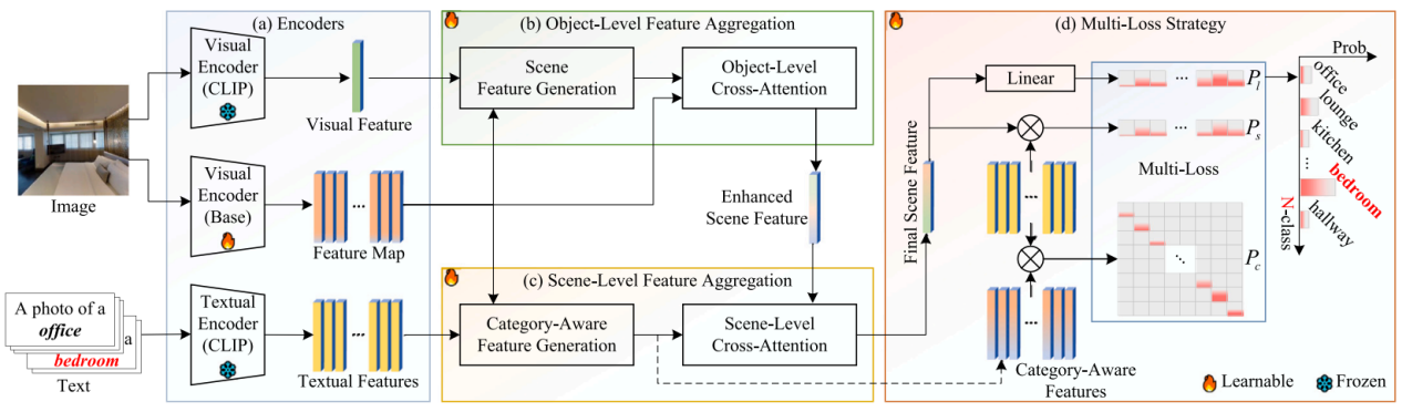 To address this, researchers first leveraged CLIP's visual features as prior information to extract local detail features highly relevant to the scene. Subsequently, CLIP's text encoder was used to generate category-specific textual semantic information. This guided the extraction of global semantic features from the image, which were then integrated via a scene-level cross-attention mechanism to form the final scene representation. To enhance model robustness, a multi-loss strategy was also introduced.