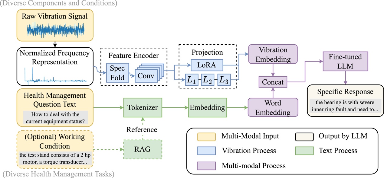 Addressing this challenge, a research team from the Intelligent Inspection and Equipment Laboratory at the Shenyang Institute of Automation (SIA), Chinese Academy of Sciences (CAS), has conducted a study proposing a unified health management framework for rotating machinery based on Large Language Models (LLMs). This framework innovatively introduces a Spectral Folded Network and a Semantic Projection mechanism, enabling deep integration of vibration signals into the semantic space of the language model. It can perform multi-task reasoning—including anomaly detection, fault diagnosis, and maintenance recommendation—within a unified architecture.