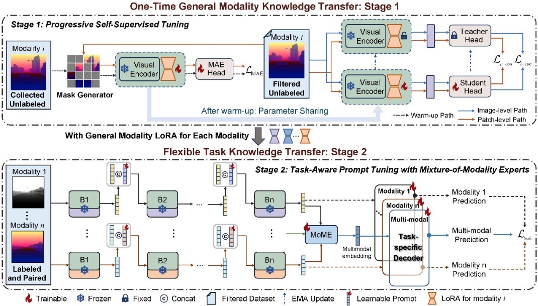 To address the issues of repetitive training and storage redundancy when switching tasks in cross-modal transfer, the team proposed an efficient cross-modal transfer framework. This framework decouples the transfer process into one-time universal modality knowledge transfer and flexible lightweight task knowledge transfer. Using unlabeled data for one-time pre-training, it generates task-reusable modality LoRAs, significantly improving data, computation, and storage efficiency for task adaptation in various downstream scenarios.