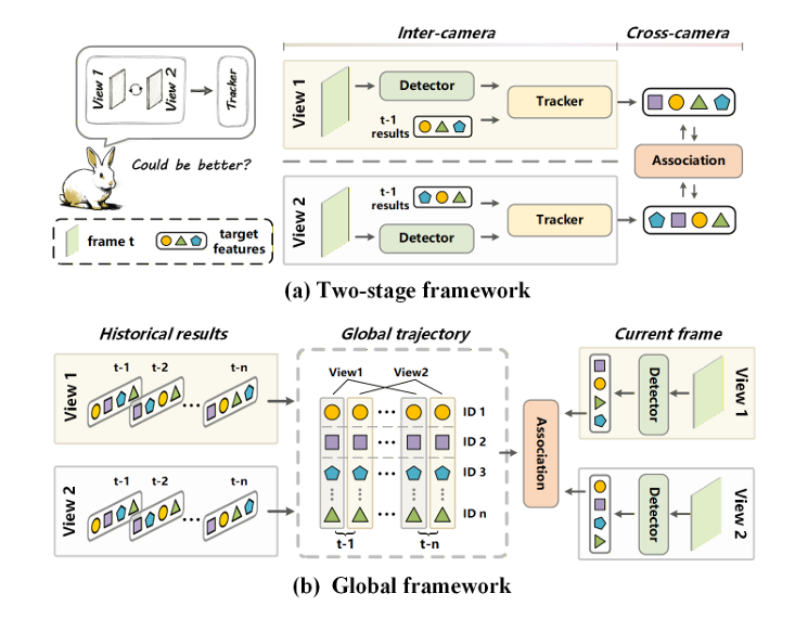 In response to the insufficient utilization of multi-view information in existing two-stage Multi-Target Multi-Camera (MCMT) tracking paradigms, the team proposed a Global MCMT Tracking Framework. By encoding local trajectories from different agents into global trajectories, the framework reformulates the tracking problem as a global trajectory-target matching problem, enabling direct utilization of multi-view information during the tracking process.