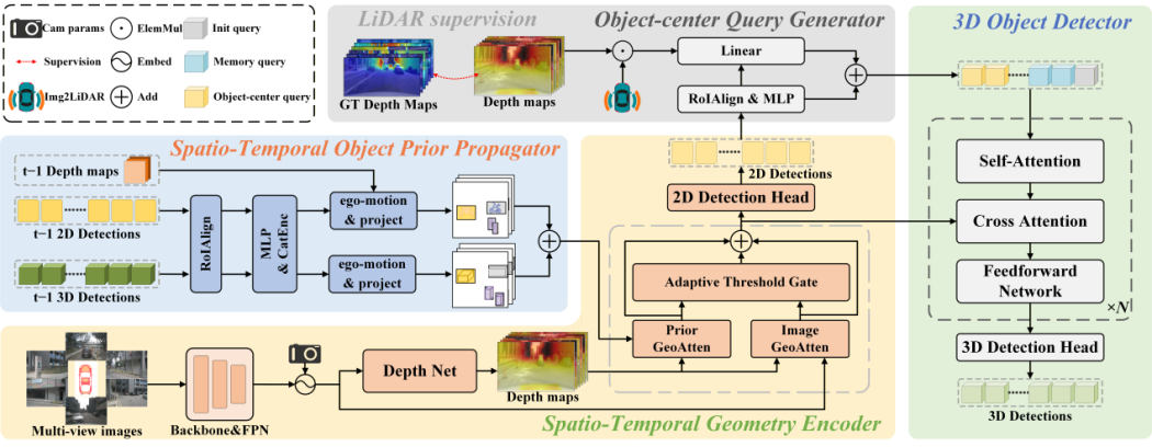 To overcome the limitations of existing surround-view 3D detectors, which rely heavily on current-frame 2D information—leading to inconsistent spatio-temporal representations and easy loss of occluded objects—the team introduced the STUR3D framework for spatio-temporal unified representation learning. This framework innovatively incorporates a Spatio-Temporal Object Prior Propagation module, explicitly fusing historical detection results and injecting depth-aware geometric priors to advance spatio-temporal alignment between 2D and 3D perceptions. It significantly enhances detection stability and localization accuracy in dynamic and occluded scenes. On the nuScenes test set, STUR3D achieves state-of-the-art performance with 57.9% mAP and 64.6% NDS, effectively resolving performance bottlenecks in existing 2D-to-3D pipelines.
