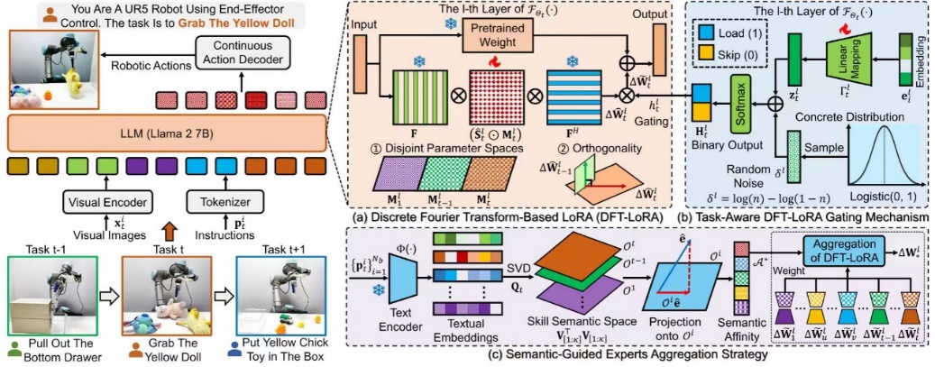 Focusing on the core challenge of continual learning in robotic manipulation across multiple tasks, the team proposed a novel continual Vision-Language-Action (VLA) task learning framework named LISA. Within this framework, knowledge of sequential manipulation tasks is represented in the discrete Fourier space, enabling the robot to continuously acquire new manipulation skills while retaining existing capabilities. This approach effectively mitigates catastrophic forgetting during continual learning and significantly improves manipulation generalization.
