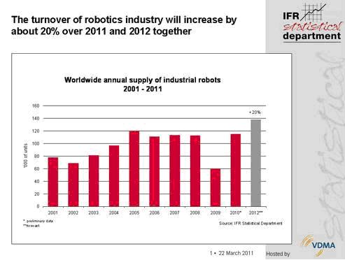 - Depending on the duration of the shortage of components on the world market the expected increase of turnover will partly be shifted from 2011 to 2012. A likely scenario is that the growth rate for 2011 will be less than 15% and that the growth rate for 2012 will be above 5%. The IFR believes that the turnover of robotics industry will increase by about 20% over both years together.