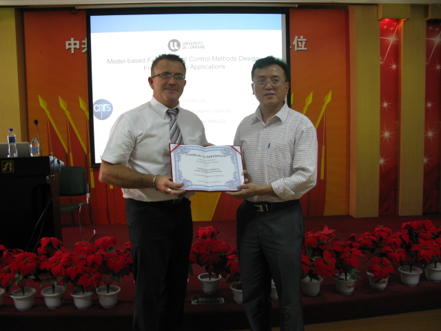 Professor Didier Theilliol from University of Lorraine visited Shenyang Institute of Automation (SIA), the Chinese Academy of Sciences (CAS) on September 19, 2012, giving a report named “Model-based Fault Tolerant Control Methods Design: From Theory to Applications”. During the visit, Prof. Theilliol was awarded CAS Visiting Professorships for Senior International Scientists (CAS Visiting Professor). Sang Zigang, vice director of SIA attended the ceremony and conferred the CAS Visiting Professor certificate to Prof. Theilliol. In the coming year, Prof. Theilliol will co-work with SIA’s rotorcraft UAVs project team to conduct research on flight control and fault tolerant control.